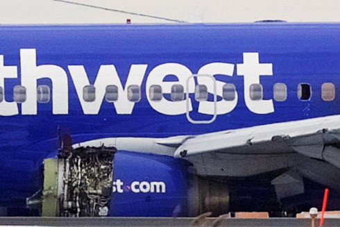 Phần động cơ bên trái bị hư của máy bay của hãng Southwest Airlines. Ảnh: Reuters