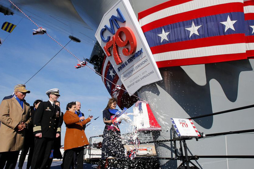 Bà Caroline Kennedy đã đập mạnh một chai rượu vào thân tàu sân bay USS John Kennedy hôm 7-12 tại xưởng đóng tàu ở Newport News, bang Virginia. Trong số các khách mời tham dự lễ “rửa tội” có cựu Ngoại trưởng Mỹ John Kerry.
