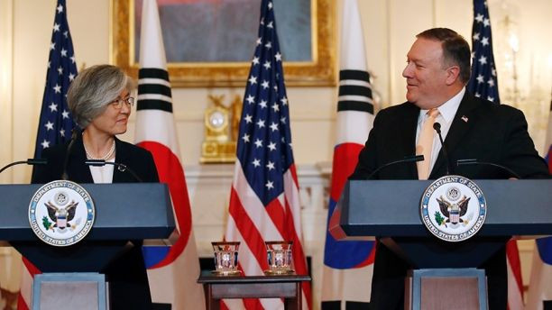Ngoại trưởng Mike Pompeo (phải) trong cuộc hội đàm với Ngoại trưởng Hàn Quốc Kang Kyung-wha