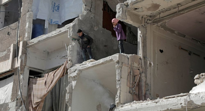 Trẻ em thoải mái chơi đùa trong khu nhà đổ nát ở Douma, Đông Ghouta, Syria