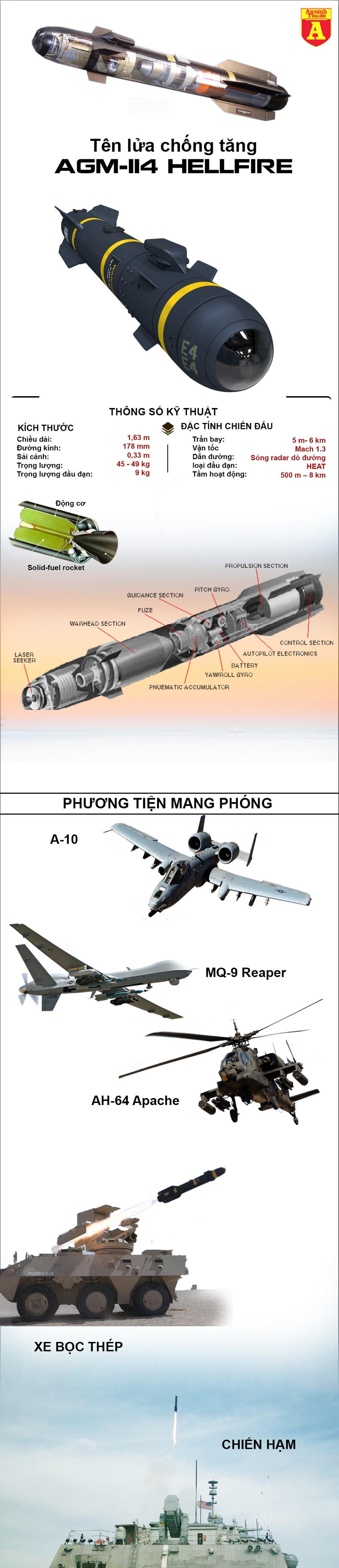 Được đưa vào sử dụng năm 1984, AGM -114 Hellfire là một tên lửa cận âm không đối đất, đa nhiệm vụ, đa mục tiêu có thể được phóng đi từ 20 loại phương tiện chiến đấu khác nhau như tàu chiến, máy bay không người lái, xe chiến đấu...