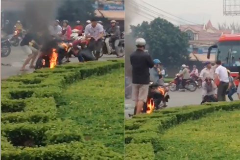 Thấy nam thanh niên kháng cự mạnh cố chạy tới chiếc xe máy đang cháy, một số người đi đường thấy vậy đã chạy tới cùng giữ nam thanh niên trên. Nạn nhân may mắn được cứu kịp thời.