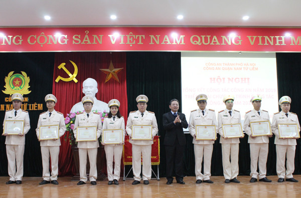 Ông Trần Đức Hoạt, Chủ tịch UBND quận Nam Từ Liêm tặng Bằng khen của Bộ trưởng Bộ Công an cho các cá nhân có thành tích xuất sắc