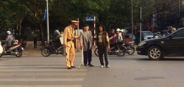 Chiến sỹ CSGT dắt người già qua đường (ảnh: Phương Thảo)
