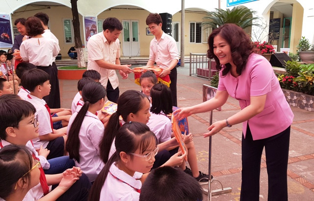 Bà Nguyễn Thị Hà, Thứ trưởng Bộ LĐ-TB&XH trao tặng các sản phẩm an toàn cho học sinh trường Tiểu học Khương Thượng vào sáng nay, 14/5