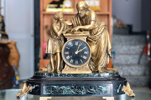 Đồng hồ xuất xứ Pháp năm 1880, chất liệu đá tự nhiên, tượng đồng mạ vàng mô tả nhà triết học Aristotle và người học trò của ông Alexander Đại đế