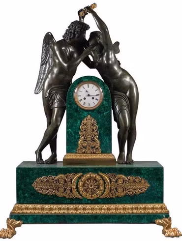 Đồng hồ xuất xứ Pháp năm 1890, tượng đồng hun trên nền đá khổng tước (Malachite) mô tả chuyện tình Thần tình yêu Cupid và nàng Psyche xinh đẹp (thần thoại Hy lạp)