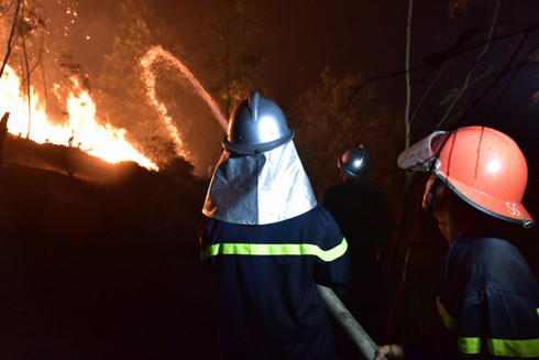Với nỗ lực của các lực lượng, đến khoảng 11h tối 5-6, lực lượng Cảnh sát PCCC đã dẫn được vòi nước vào một số điểm trọng yếu gần khu dân cư, đền Sóc để chữa cháy. Trước đó, do địa hình đồi núi dốc, rừng cây dày đặc nên lực lượng chức năng chỉ thực hiện dập thủ công như lập dải phân cách, phát luồng tuyến chia ranh giới chống cháy lan…