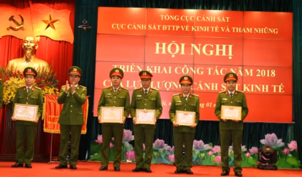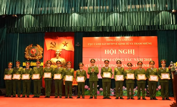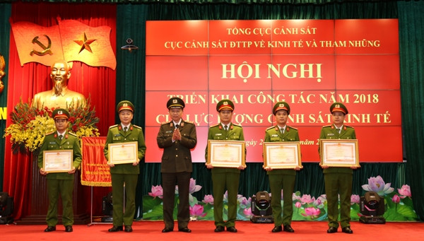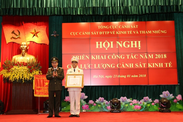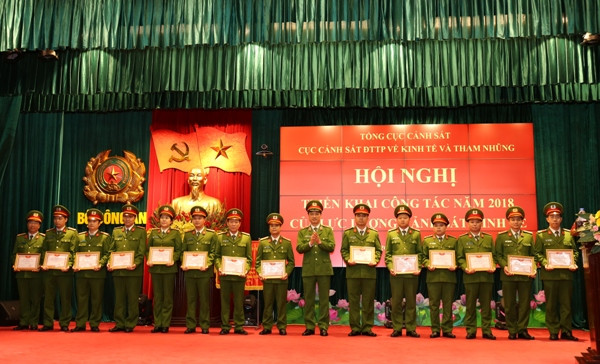 Thiếu tướng Nguyễn Duy Ngọc, Phó Tổng cục trưởng Tổng cục Cảnh sát, kiêm Cục trưởng Cục Cảnh sát ĐTTP về kinh tế và tham nhũng trao danh hiệu Chiến sĩ thi đua cơ sở cho các cá nhân thuộc Cục CSKT có thành tích xuất sắc trong phong trào thi đua 2017