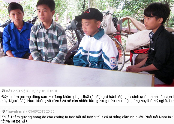 Bạn đọc Đỗ Cao Thiệu xúc động: “Thật đáng khâm phục và xúc động vì hành động hy sinh quên mình của bạn trẻ này” và cho rằng, đó là tấm gương sáng để thế hệ trẻ ngày nay noi theo. Cùng chung quan điểm đó, bạn đọc Hải Yến bày tỏ: “Tấm gương sáng của em thực sự làm hàng triệu triệu người cảm phục”. Nhiều bạn đọc đã thốt lên rằng: “Người Việt Nam không vô cảm! Và sẽ còn nhiều tấm gương nữa cho cuộc sống thêm ý nghĩa hơn”.