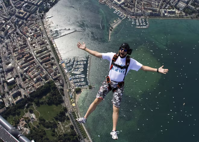 Christoffe Jonin, thuộc đội Sky Blue FF, vừa nhảy ra khỏi trực thăng với một chiếc dù từ độ cao 1.300 mét phía trên hồ Leman và thành phố Geneva, trong ngày cuối cùng của Fetes de Geneve