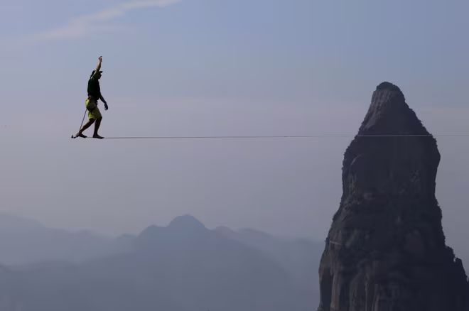 Aisikaier Wubulikasimu, một diễn viên nhào lộn 40 tuổi, đang đi bộ trên dây nối giữa 2 khinh khí cầu dài 20,5 m, rộng 2 inch, ở quận Thạch Lâm, tỉnh Vân Nam, Trung Quốc.