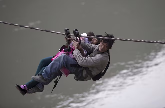 Người đàn ông cùng vợ và con sử dụng dây zipline để qua sông Nộ Giang (Trung Quốc). Theo như truyền thông đã đưa tin, cư dân ở đây đã phải sử dụng dây zipline để qua sông trong nhiều năm bởi nơi đây không có lấy một cây cầu