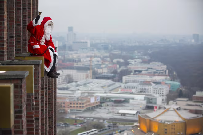 Người đàn ông cải trang thành ông già Noel tạo dáng ngay trước tháp Kollhoff tại quảng trường Potsdamer Platz, Berlin ( Đức)