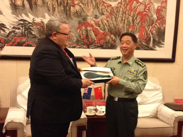 Bộ trưởng Quốc phòng New Zealand Gerry Brownlee (trái) tặng quà lưu niệm cho Trung tướng Zhang Shibo, Chủ tịch Đại học Quốc phòng Trung Quốc, tại Bắc Kinh ngày 28-9