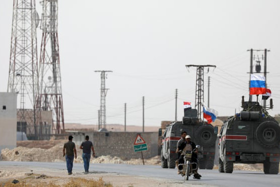 Cờ Nga và Syria xuất hiện trên xe quân sự gần thị trấn Manbij