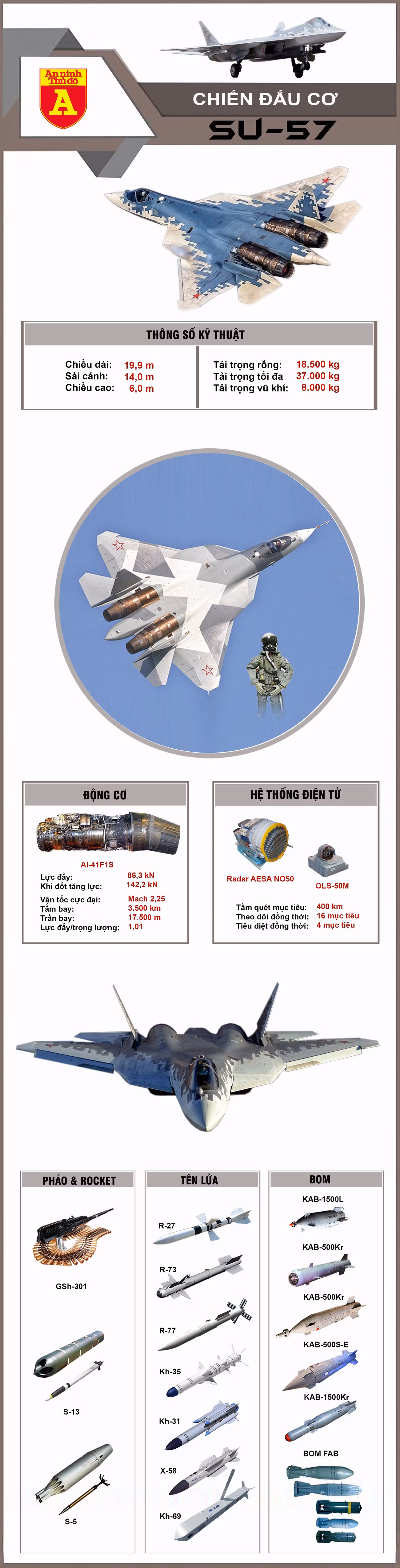 Su-57 là tiêm kích thế hệ 5 đầu tiên của Nga, được thiết kế để cạnh tranh với dòng F-22, F-35 Mỹ và J-20 Trung Quốc. Su-57 được phủ vật liệu hấp thụ sóng radar và có thiết kế tối ưu cho khả năng tàng hình trước thiết bị trinh sát điện tử.