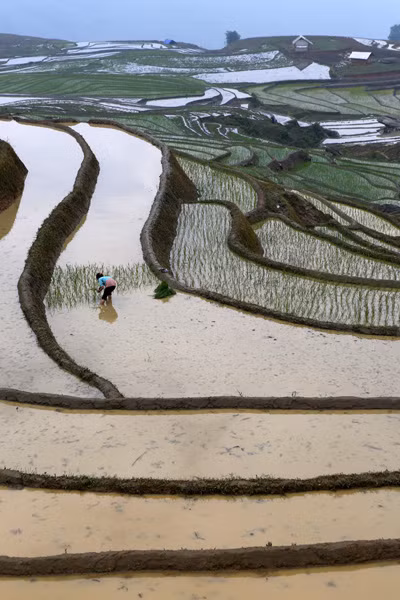 Một người dân đang cấy trên những nếp ruộng bậc thang
