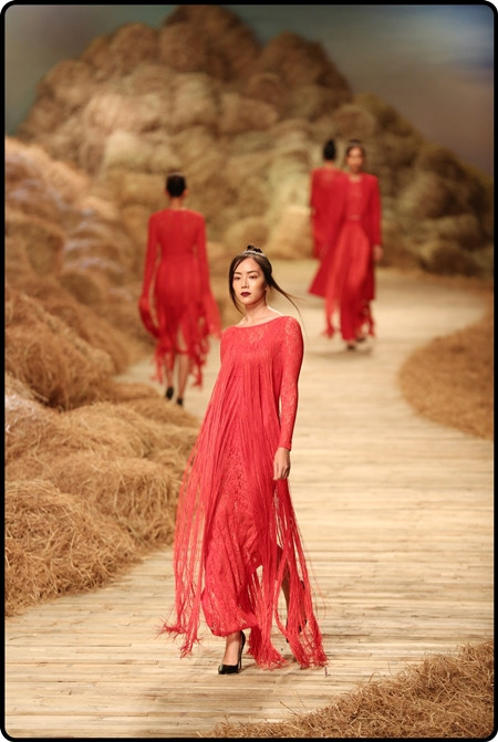 Lần này, NTK Đỗ Mạnh Cường giới thiệu 4 bộ sưu tập dựa trên những cảm nhận của một du học sinh Pháp về vẻ đẹp miền quê thanh bình: Jean, caro, họa tiết hoa cúc và tua rua với tổng số thiết kế lên đến 185 mẫu trang phục. Đáng chú ý, không gian trình diễn cũng được nhà thiết kế "hô biến" đậm chất quê với những ụ rơm lớn, tiếng dế kêu, tiếng "ụm bò" quen thuộc hay thoang thoảng mùi sương mai thanh bình, tinh khiết.
