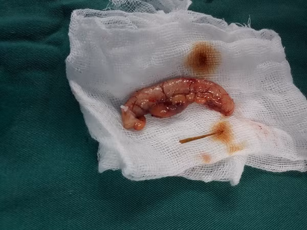 Mẩu ruột thừa cùng chiếc tăm đâm thủng ruột thừa của bệnh nhân M. được lấy ra