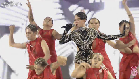 Mặc dù gặp trục trặc, nhưng Thu Minh vẫn thể hiện bản lĩnh sân khấu của mình, tiếp tục thể hiện trọn vẹn ca khúc "Ngọc ngà Việt Nam"