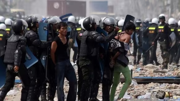 Cảnh sát bắt giữ những người biểu tình quá khích bên ngoài một nhà máy may ở Phnom Penh