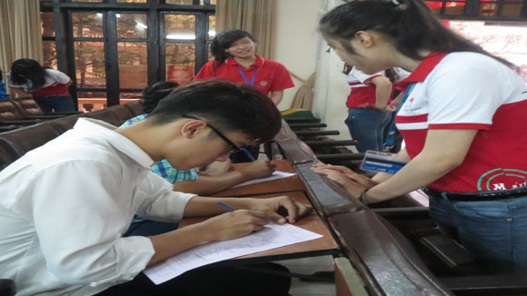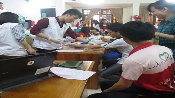 Chỉ hơn 7h sáng đã có hàng trăm sinh viên của học viện nhiệt tình tham gia hiến máu. Các bàn đăng kí, phòng lấy máu xét nghiệm, phòng lấy máu, phòng chăm sóc sau hiến máu... luôn nhộn nhịp người.