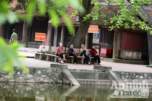 Những cụ bà ngồi nghỉ ngơi dưới gốc cây bàng trong khuôn viên chùa