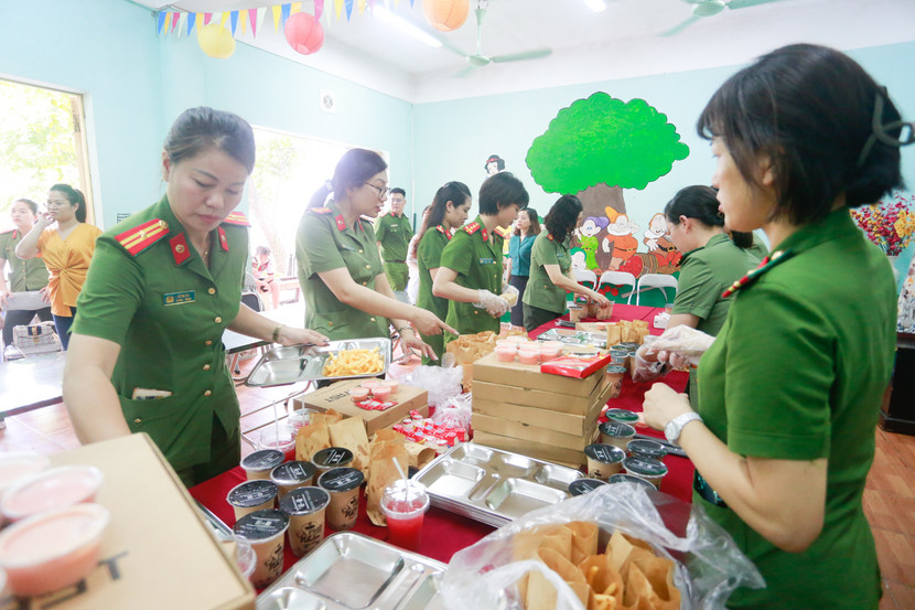 | Hội trường Nhà nuôi dưỡng trẻ em Hữu Nghị Đống Đa tràn ngập niềm vui khi các cán bộ, chiến sĩ chuẩn bị quà tặng |