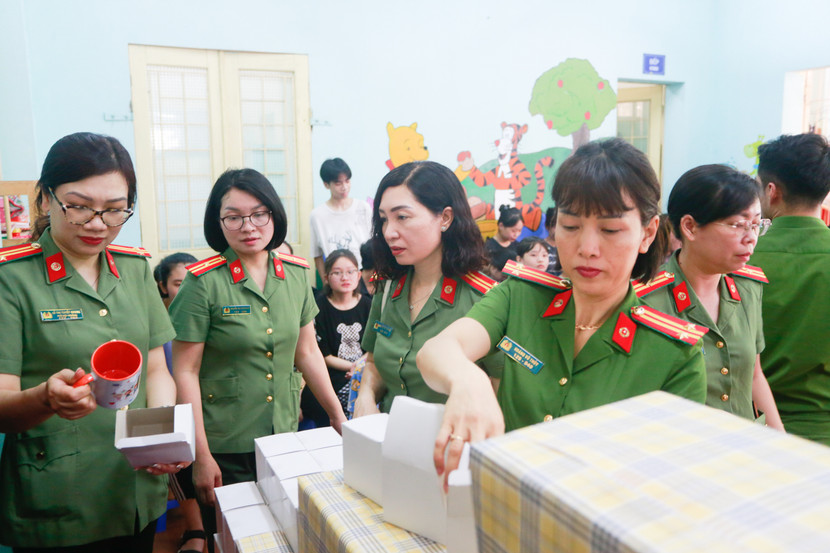 | Những nữ cán bộ, chiến sĩ Công an quận Đống Đa mang những phần quà chuẩn bị cho chương trình |