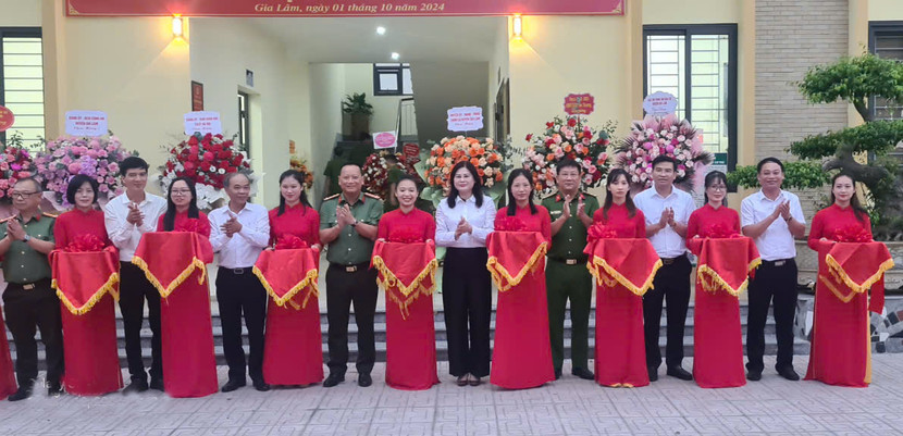 | Đại tá Phạm Thanh Hùng; đồng chí Đặng Thị Huyền - Chủ tịch UBND huyện Gia Lâm, cùng các đồng chí lãnh đạo thăm quan cơ sở vật chất trụ sở Công an xã Yên Thường |