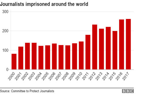 Số lượng nhà báo bị sát hại là minh chứng mạnh mẽ để khẳng định sự nguy hiểm mà các nhà báo, nhân viên truyền thông phải đối mặt. Tuy nhiên, đó không phải là mối đe dọa duy nhất mà các nhà báo gặp phải. Theo CPJ, năm 2017 là năm có số lượng nhà báo bị bắt giam cao kỷ lục, 262 người, cao nhất trong gần ba thập kỷ trở lại đây.