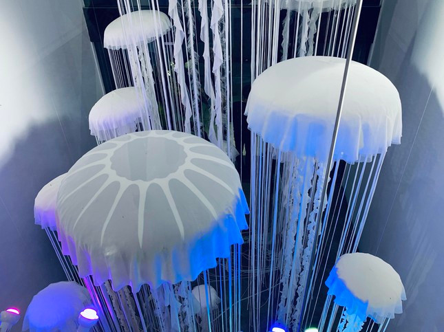 2 tác phẩm sắp đặt nghệ sĩ mang đến lần này rất độc đáo. Với tác phẩm "Gia đình", Trương Tân đã tạo ra 42 con sứa bằng lụa và polyester được chế tạo một cách tỉ mỉ. Với ánh đèn tự đổi màu dịu nhẹ, những con sứa được treo lơ lửng trên trần nhà cao 5,5 mét ở lối vào của phòng tranh. Tác phẩm hòa vào kiến trúc của phòng tranh khi trần nhà thấp dần xuống phía dưới tầng lửng.