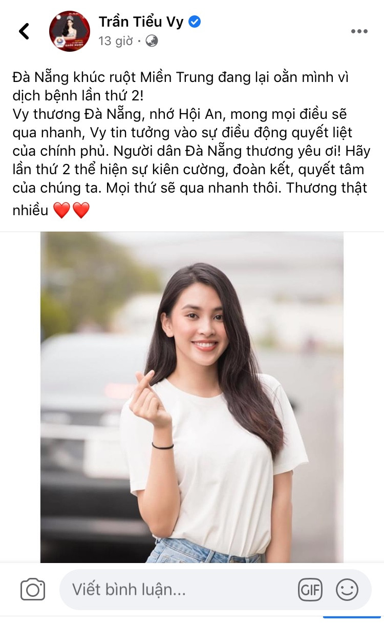 Lan tỏa tinh thần đoàn kết và chống dịch cùng cả nước, Hoa hậu Việt Nam 2018 Trần Tiểu Vy đăng tải trên trang mạng xã hội cá nhân với nội dung: “Đà Nẵng, khúc ruột miền Trung đang lại oằn mình vì dịch bệnh lần thứ 2. Vy thương Đà Nẵng, nhớ Hội An, mong mọi điều sẽ qua nhanh, Vy tin tưởng vào sự điều động quyết liệt của Chính phủ. Người dân Đà Nẵng thương yêu ơi! Hãy lần thứ 2 thể hiện sự kiên cường, đoàn kết, quyết tâm của chúng ta. Mọi thứ sẽ qua nhanh thôi. Thương thật nhiều”.