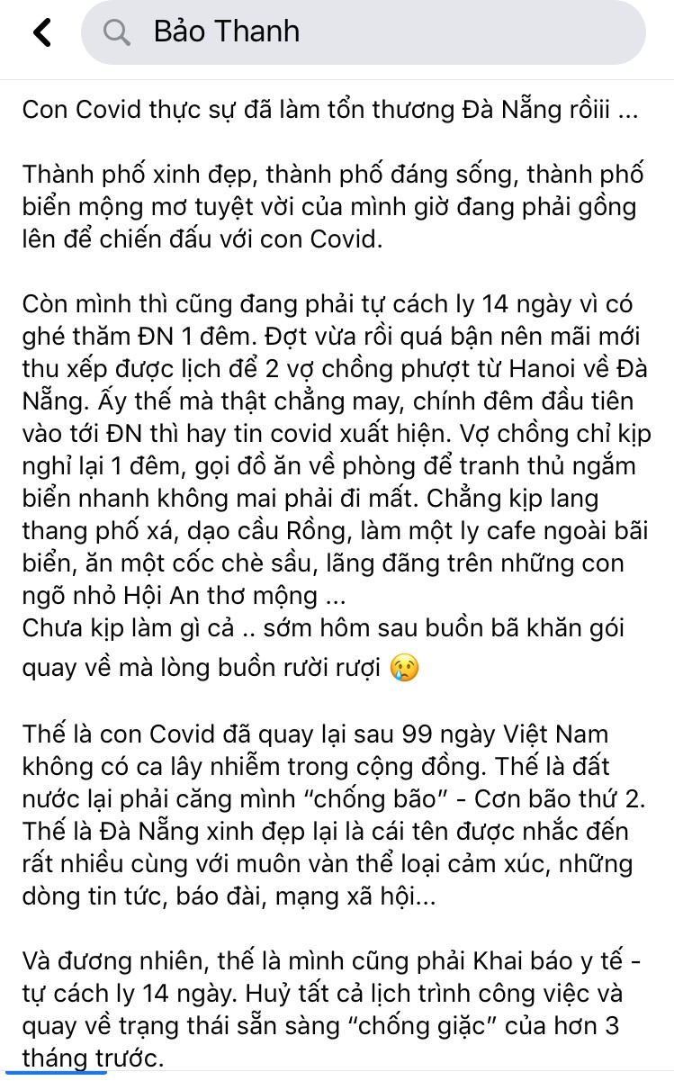 Tối ngày 27/7, nữ diễn viên Bảo Thanh chia sẻ trên trang facebook cá nhân của cô về những kỷ niệm đáng nhớ với Đà Nẵng và bày tỏ niềm cảm thông với thành phố đáng sống này.