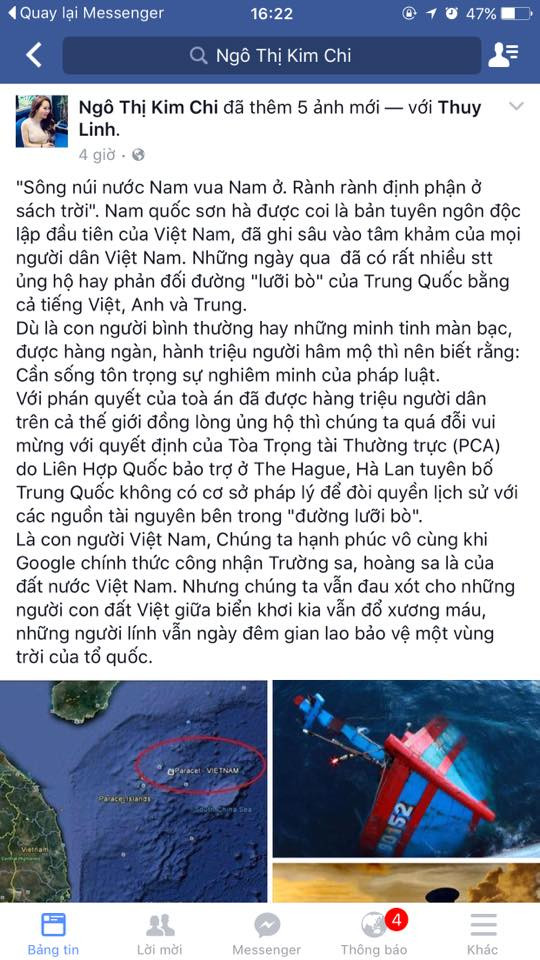 Cũng mới đây, trên trang cá nhân của mình, “Nữ hoàng Doanh nhân 2015” Ngô Thị Kim Chi đã chia sẻ quan điểm của mình về phán quyết của PCA.