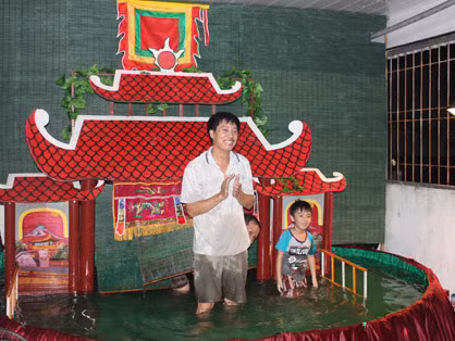 Nghệ nhân Phan Thanh Liêm với mô hình rối nước tại nhà