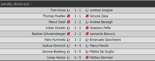 Không hổ danh là một cặp đấu lớn, đến loạt luân lưu giữa Italia và Đức cũng đã diễn ra theo cách kịch tính và hấp dẫn nhất có thể. Đây xứng đáng là một trong những loạt pen căng thẳng nhất trong lịch sử EURO, khi phải cần đến 9 lượt sút, thì người Đức mới có thể thở phào cùng chiến thắng trước Italia, với tỉ số cuối cùng là 6-5.