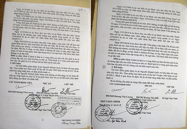 Tuy nhiên, tại trang 2, Kết luận giám định pháp y tâm thần nêu trên cùng số, cùng ngày, cùng bác sĩ như thành phần giám định của bản giám định được lưu trong hồ sơ lại kết luận: “Bị án Nguyễn Khánh Quốc hoàn toàn không có khả năng và sức khỏe để tiếp tục chấp hành án phạt tù, bị án phải được vào cơ sở bắt buộc chữa bệnh theo đúng quy định của pháp luật (sao y bản chính ngày 25-11-2019, tại TAND tỉnh Thanh Hóa”.
