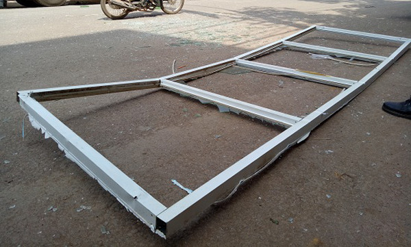 Một tấm cửa kính trong ngôi nhà bị sức ép vụ nổ hắt văng ra ngoài đường