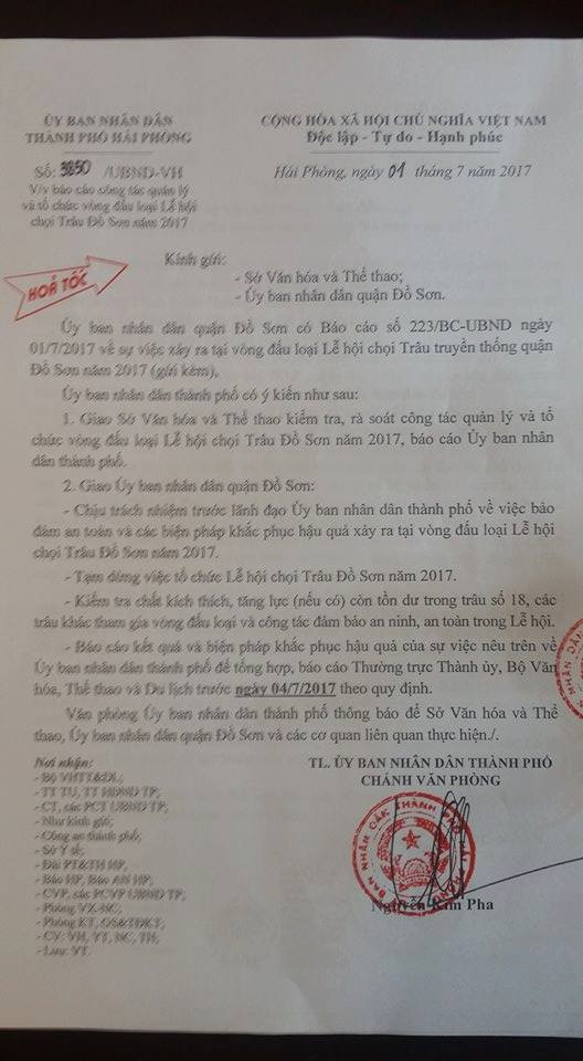 Ngoài ra, công văn nêu: UBND quận Đồ Sơn chịu trách nhiệm trước lãnh đạo UBND TP Hải Phòng về việc bảo đảm an toàn và các biện pháp khắc phục hậu quả xảy ra tại vòng đấu loại Lễ hội chọi trâu Đồ Sơn 2017. Tạm dừng việc tổ chức Lễ hội chọi trâu 2017.