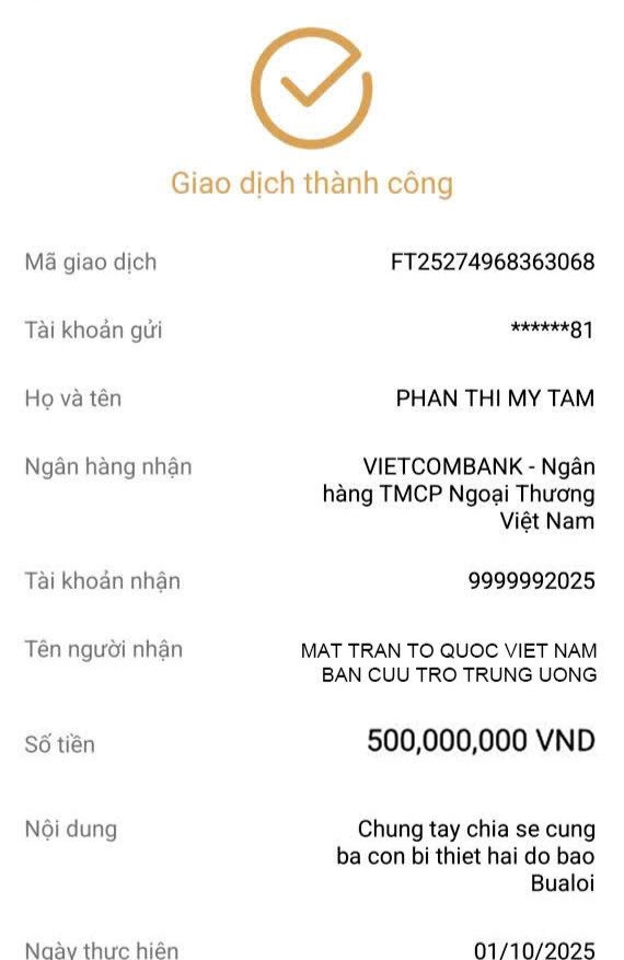 Mới đây, trên mạng xã hội cá nhân, ca sĩ Mỹ Tâm thông báo về việc đã quyên góp số tiền 500 triệu đồng đến Mặt trận Tổ quốc Việt Nam - Ban cứu trợ Trung ương với mong muốn chung tay chia sẻ cùng bà con bị thiệt hại bởi bão Bualoi.
