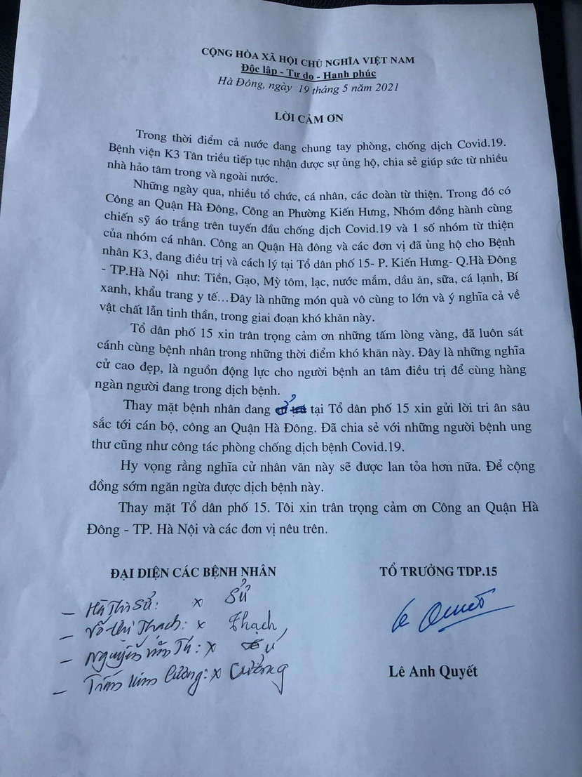 Xúc động trước sự quan tâm, tấm lòng của Công an quận Hà Đông, các bệnh nhân, người nhà bệnh nhân và đại diện tổ dân phố 14, 15 phường Kiến Hưng đã gửi những bức thư cảm ơn, tri ân sâu sắc đến Ban chỉ huy, cán bộ, chiến sĩ Công an quận; và mong muốn nghĩa cử cao đẹp này sẽ được lan toả hơn nữa để cộng đồng sớm ngăn ngừa được dịch Covid-19.