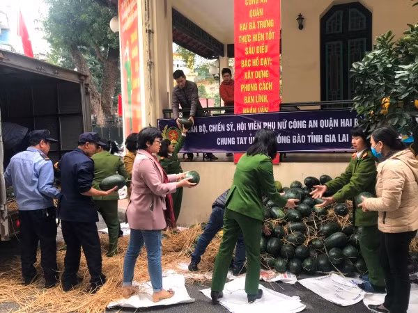 Khuôn viên trụ sở Công an quận Hai Bà Trưng, cuối giờ sáng đến đầu giờ chiều 11-2, có một không khí thật “lạ”. Quên cả giờ nghỉ, những bóng sắc phục, thường phục cần mẫn, hồ hởi bê, chuyền từng quả dưa hấu từ trên thùng xe tải, đưa vào vị trí được chuẩn bị sẵn, với rơm rạ và những tấm bạt nilon khổ lớn, để tránh dập, hỏng. Loáng cái, hơn 1.000 quả dưa hấu đã “vào vị trí tập kết”.