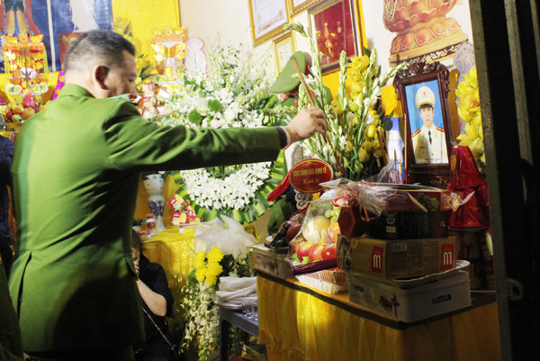 Đại tá Ngô Duy Thắng, Trưởng phòng Cảnh sát quản lý hành chính về trật tự xã hội CATP Hà Nội, đơn vị Cụm trưởng Cụm thi đua số 3 thắp hương bàn thờ liệt sỹ Đại úy Phạm Công Huy