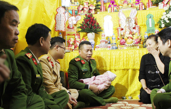Nằm trong vòng tay của Đại tá Ngô Duy Thắng, Trưởng phòng Cảnh sát quản lý hành chính về trật tự xã hội, đơn vị Cụm trưởng cụm thi đua số 3, bé Bún (tên thân mật của con gái Liệt sỹ Đại úy Phạm Công Huy) vẫn ngủ ngon lành. Chia sẻ với đoàn công tác, bà nội bé Bún cho hay, bố cháu hy sinh khi cháu mới 6 tháng tuổi, từ hôm đó đến nay cháu đã lớn thêm rất nhiều, ê a, bi bô trò chuyện với những người xung quanh. Và đặc biệt, bé đã mọc mấy chiếc răng mà khi bố Huy còn sống, lúc bế ẵm cứ sờ tay vào lợi để xem con đã sắp mọc răng chưa.