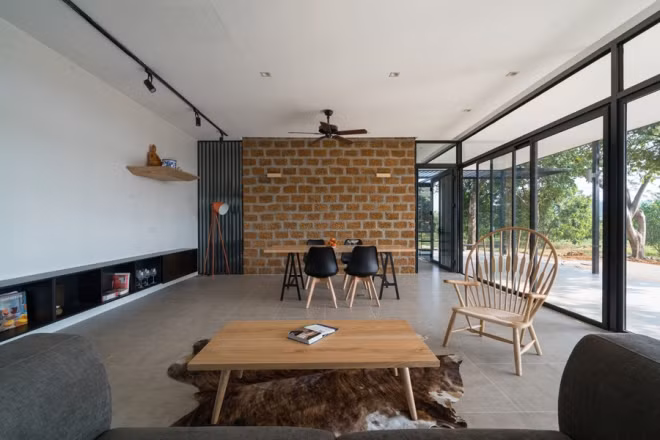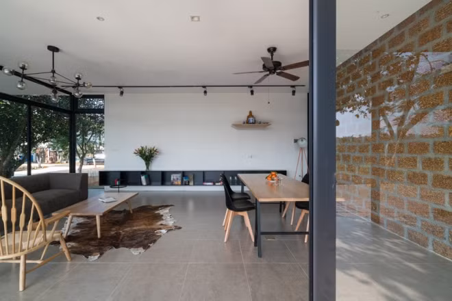 Ngôi nhà có sự gắn kết với địa bàn xây dựng nhờ vật liệu địa phương là mảng tường đá ong nâu ấm áp.