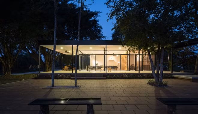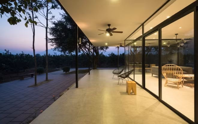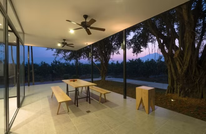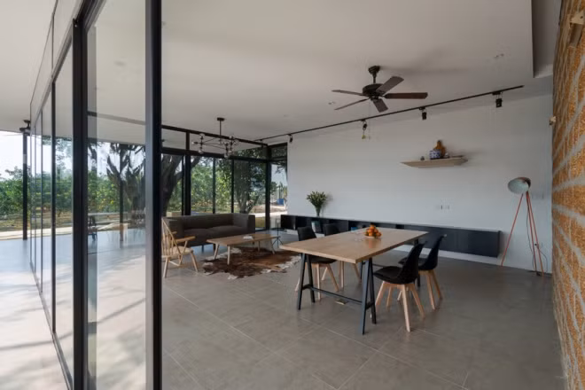 Bao quanh nhà chủ yếu là phần kính giúp không gian bên trong và bên ngoài hòa hợp.