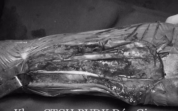 Vì thế, các bác sĩ đã tiến hành phẫu thuật cắt bỏ mạc hãm bị viêm dày xơ cứng, cắt u nang thanh dịch gân duỗi trong lòng chứa nhiều dịch nâu đen, lấy tổ chức phần mềm làm xét nghiệm. Quá trình mổ cho thấy, gân duỗi của bệnh nhân bị mài mòn trên 1 đoạn dài và đã đứt rời, bệnh nhân được cắt bỏ gân duỗi bị xơ và lấy 1 đoạn của gân tự thân dài khoảng 5cm ghép vào để phục hồi vận động của ngón út.