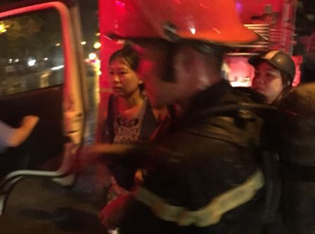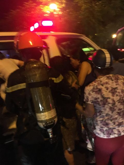 Bà Trần Thị Xuân được Phòng CS PCCC số 1 dìu ra khỏi đám cháy và đưa đi Bệnh viện Thanh Nhàn cấp cứu kịp thời